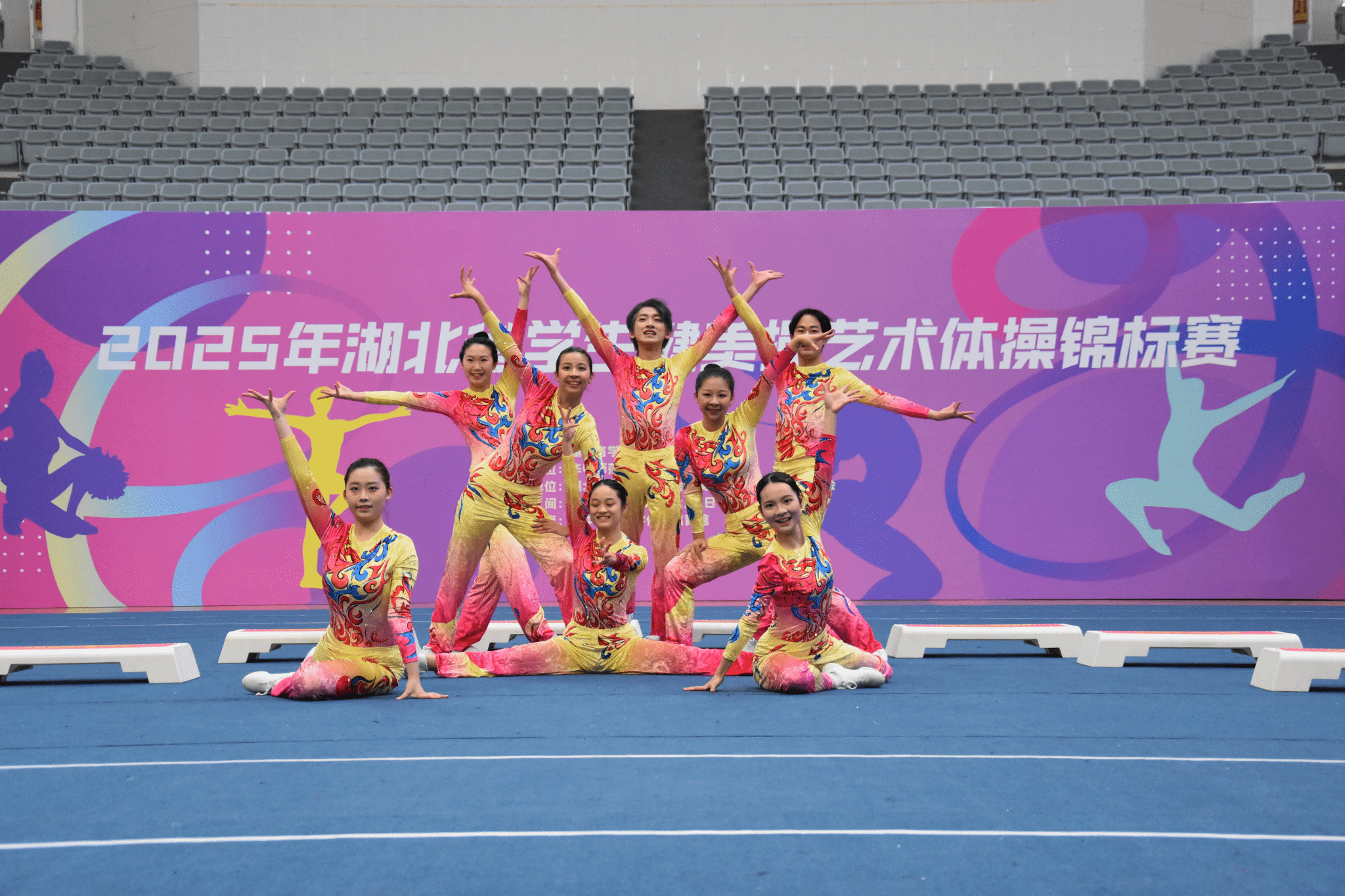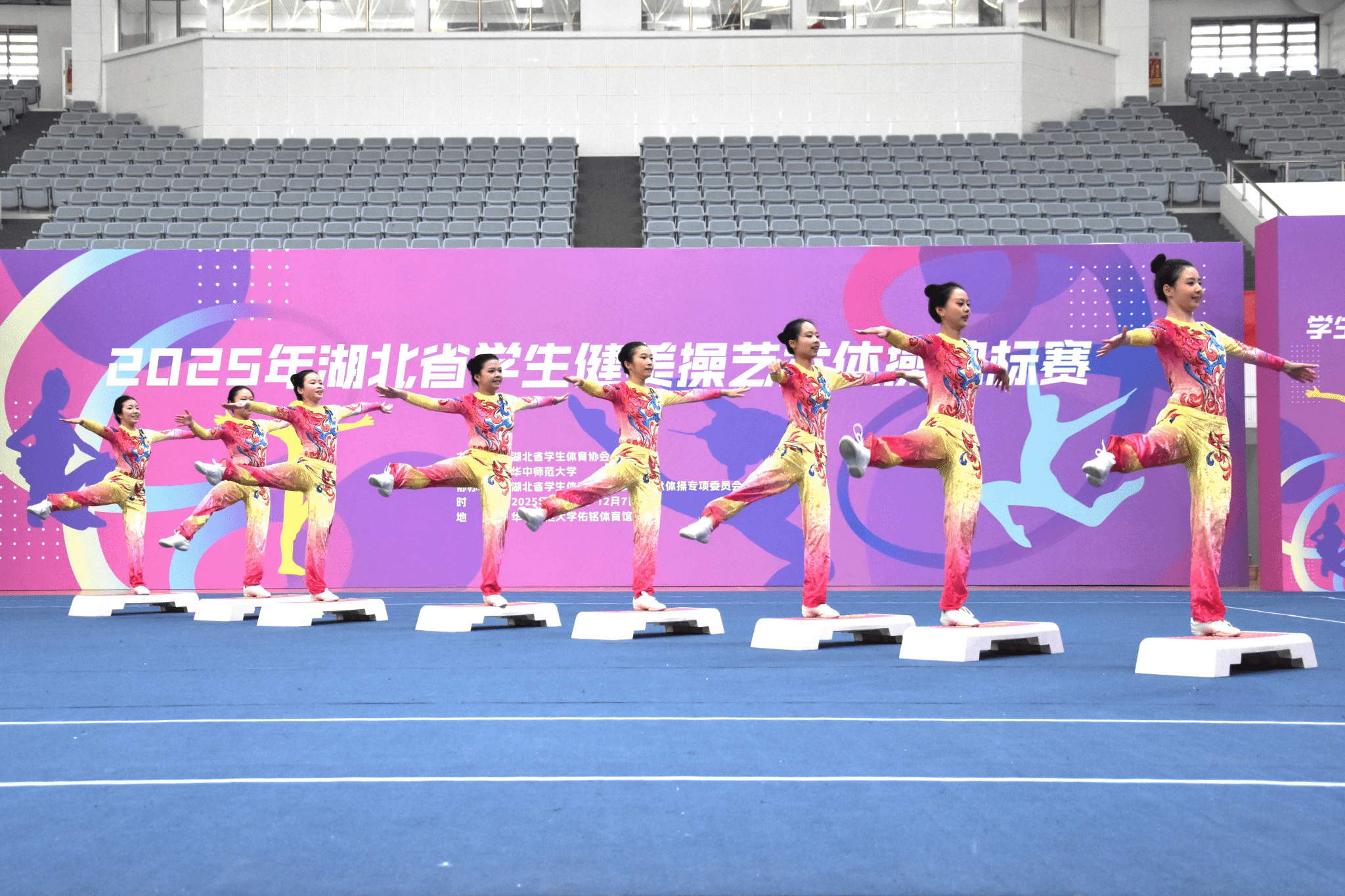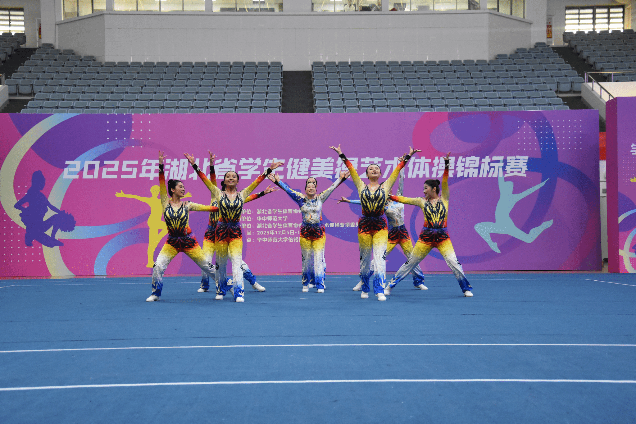 12月5日至7日,2025年湖北省学生健美操艺术体操锦标赛在华中师范大学体育馆隆重举行。来自全省132所学校的2079名运动员齐聚桂子山,同台竞技,共展青春风采。我校健美操队在比赛中团结协作、奋力拼搏,凭借精湛的技术和富有感染力的表现,最终斩获多项荣誉:有氧舞蹈(2021版)第一名、有氧踏板(2017版)第二名、有氧踏板(2021版)第三名。