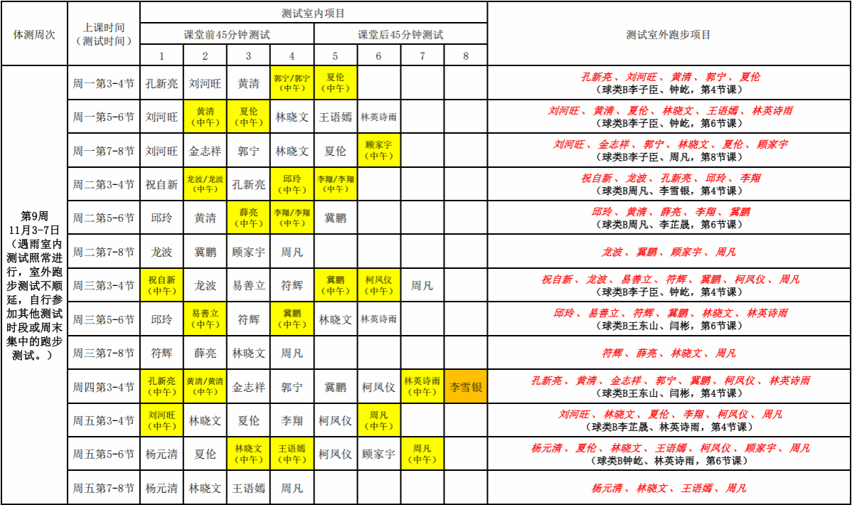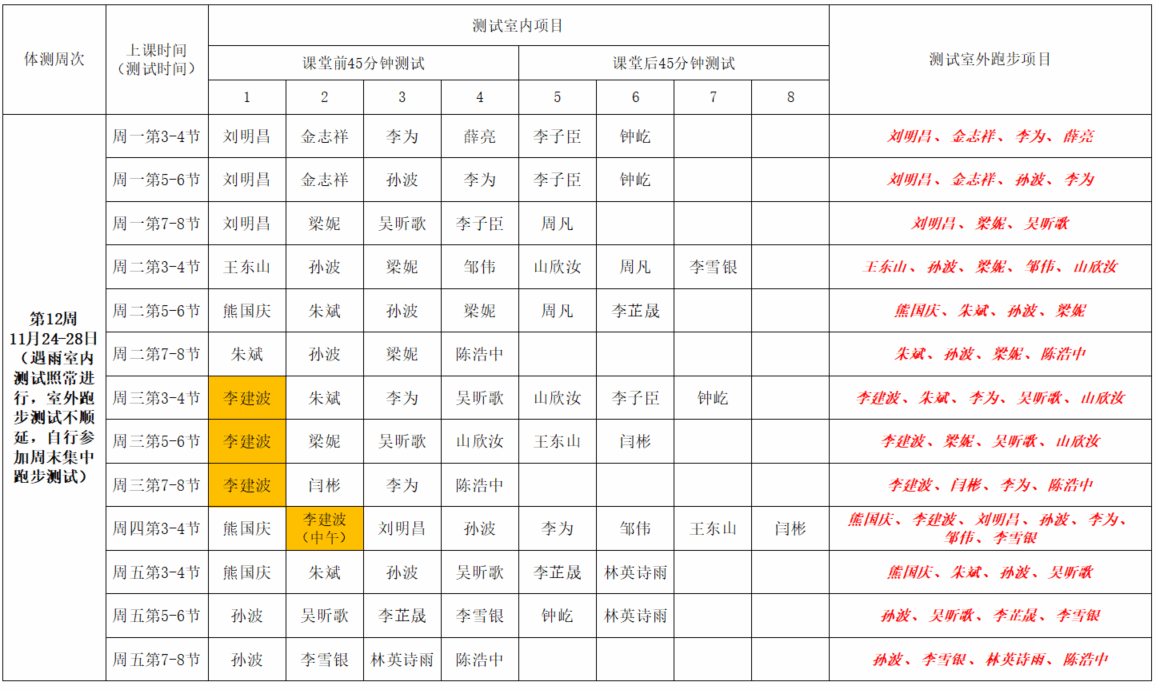 学校本部学生:室内项目2025年10月31日、11月6日、11月28日,晚上18:40-21:00,室外项目2025年11月30日,上午08:30-11:30、下午14:30-17:30(2025年度最后一轮测试时间另行通知)